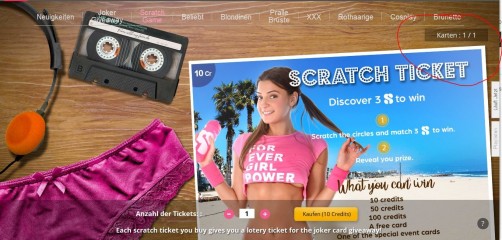 Once you buy a scratch ticket, press and hold your left mouse button and "rub" it over each of the six smaller circles on the card until either an "X" or an "S" (the iStripper symbol) is revealed on each one. If you get 3 or more "S" symbols, then rub the large center circle until your prize is revealed and click on that prize to receive it.